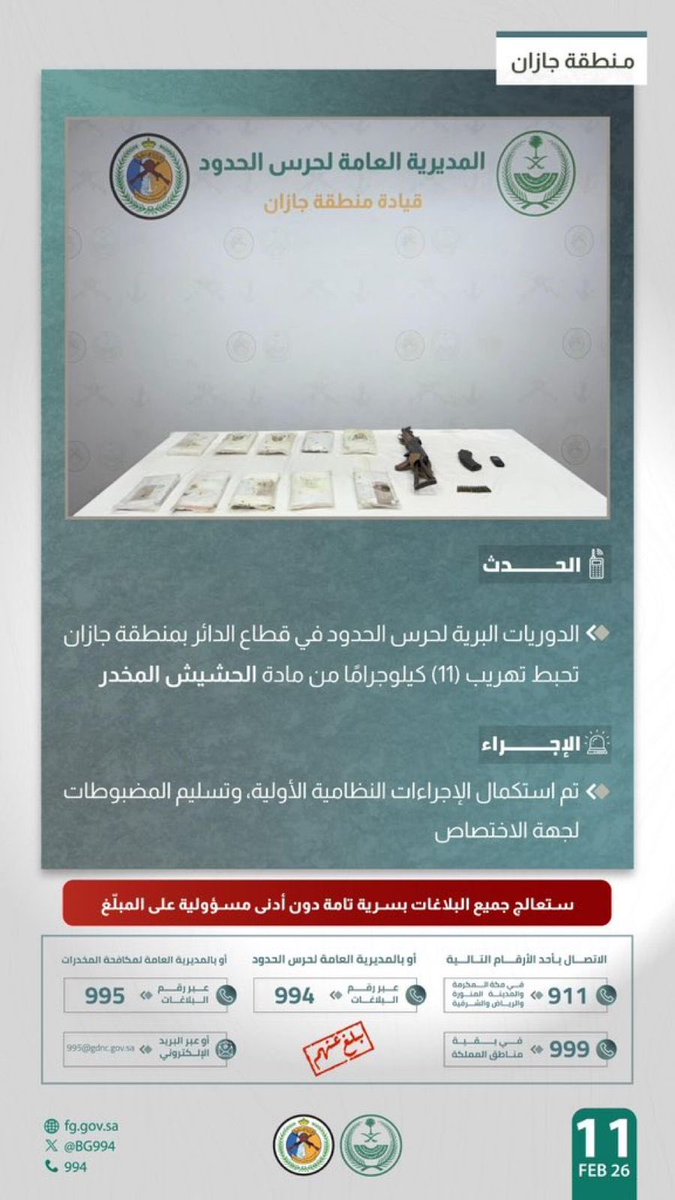 إحباط تهريب 11 كيلوجرامًا من الحشيش المخدر على الحدود الجنوبية للمملكة | محليات | شبكة نفود الإخبارية
