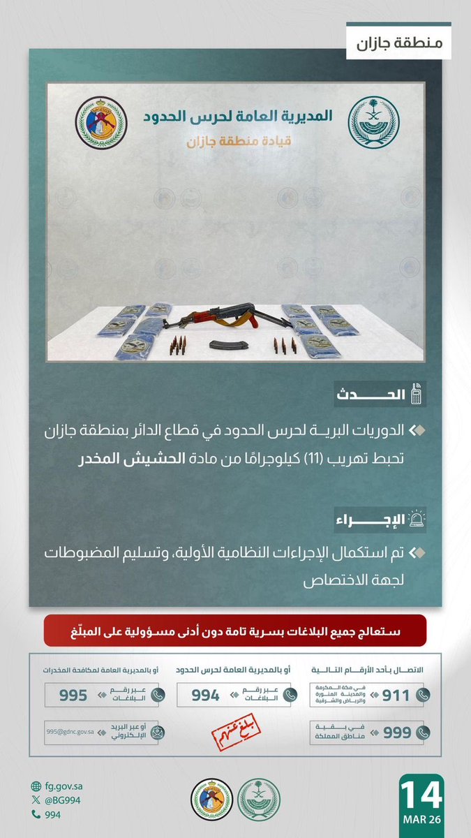 أحبطت الجهات الأمنية محاولة تهريب 11 كيلوجرامًا من مادة الحشيش المخدر في عملية أمنية نفذت مؤخرًا، ما أسفر عن ضبط الكمية وإيقاف عدد من المشتبه بهم تمهيدًا لإحالتهم إلى الجهات القضائية المختصة. وقالت مصادر أمنية إن العملية جاءت ضمن جهود متواصلة لمكافحة تهريب وترويج المخدرات، حيث شملت إجراءات تفتيش ومتابعة استخدمت خلالها أساليب كشف روتينية وميدانية أدت إلى إحباط محاولة إدخال الكمية المضبوطة.