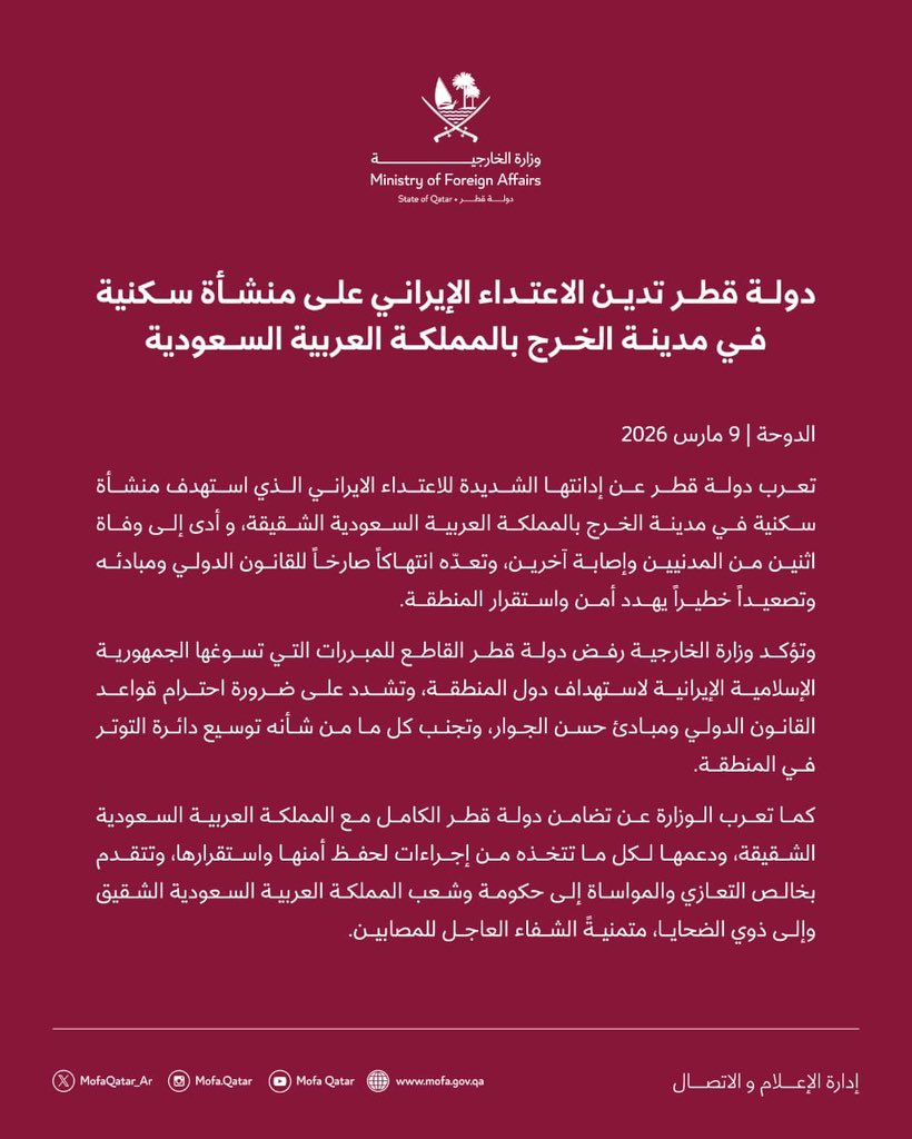 قطر تدين الاعتداء الإيراني على الخرج وتؤكد دعمها للمملكة العربية السعودية