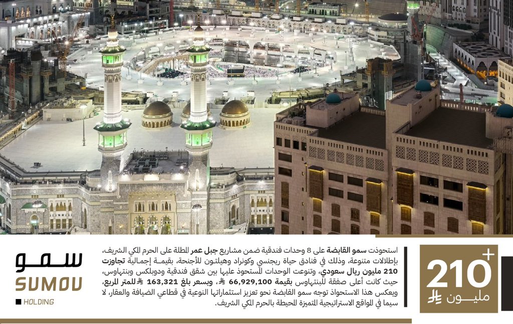 أعلنت سمو القابضة إتمام صفقة استحواذ على ثماني وحدات فندقية ضمن مشاريع جبل عمر المطلة على الحرم المكي الشريف، شملت وحدات في فنادق حياة ريجنسي وكونراد وهيلتون للأجنحة، بقيمة إجمالية تجاوزت 210 ملايين ريال سعودي. وتنوعت الوحدات التي شملتها الصفقة بين شقق فندقية ومساكن دوبلكس وبنتهاوس، بما يعكس استراتيجية توسعية في سوق الضيافة والعقارات الفندقية في مدينة مكة المكرمة.